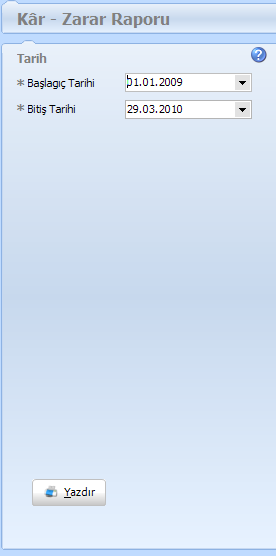 Belirleyeceğimiz bir tarih kriteri aralığında Yazdır butonuna tıklamamız yeterlidir.Gelirlerden elde ettiğimiz rakamlar sol tarafta giderlerde yapmış olduğumuz harcamalar sağ tarafta olmak üzere liste halinde Genel Kar – Zararımız ekrana gelecektir.