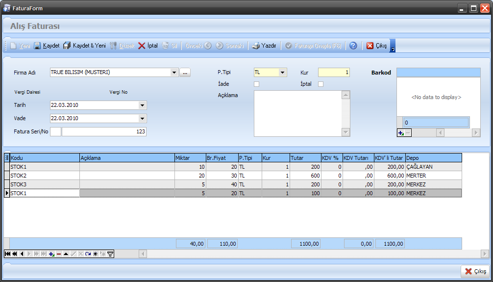 Konuyu daha iyi anlayabilmemiz için birer örnek gerçekleştirelim. Aşağıdaki Alış Faturası girişiyle 3 adet birbirinden farklı stoğu depolarımıza alalım. Örneğin STOK1’den 15 adet satın alıyorum. Bunun 10 tanesini Çağlayan’daki depoma, aynı anda müşterilerime sunabilmek için 5 tanesini de Merkezimde bulunduruyorum.STOK2’yi Merter’e, STOK3’üde acil durumlarda lazım olacağını düşündüğüm için Merkezimde tutuyorum.