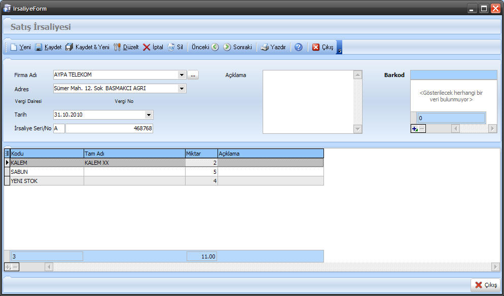 Yeni tuşuna tıkladığımızda aşağıdaki irsaliye ekranını karşımıza getirecektir.Firma Adı;