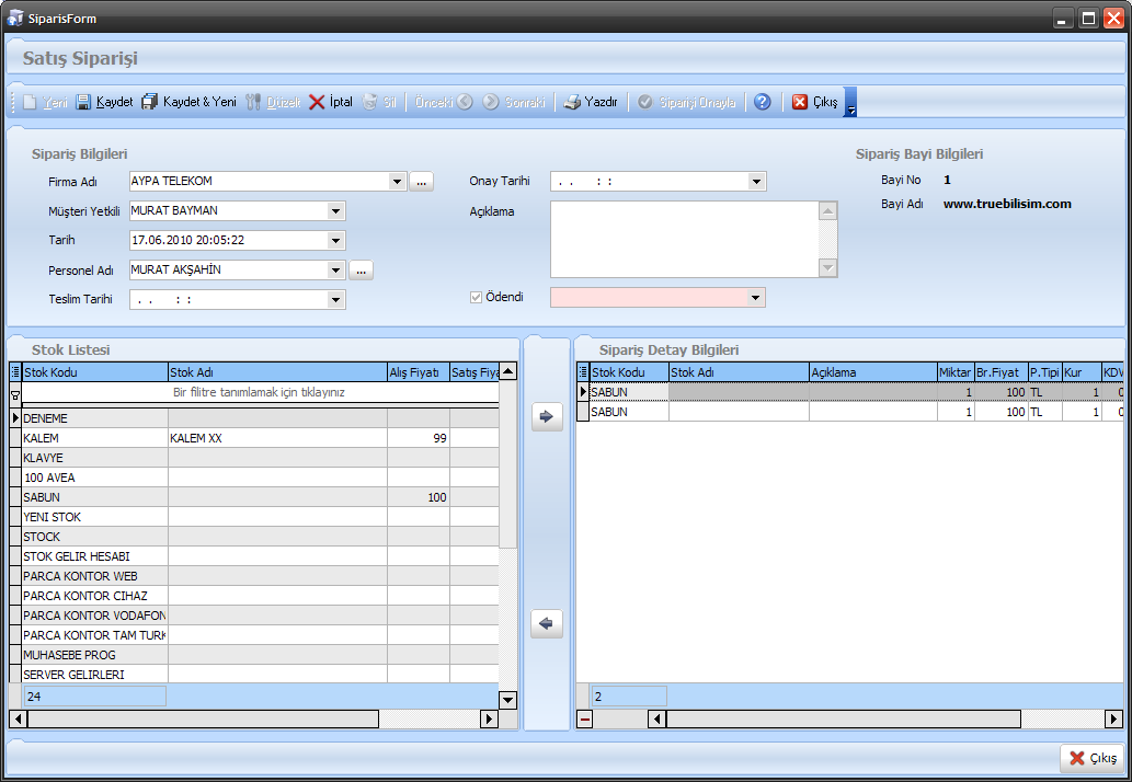 Yeni tuşuna tıkladığımızda yukarıdaki sipariş giriş ekranını karşımıza getirecektir.Firma Adı;