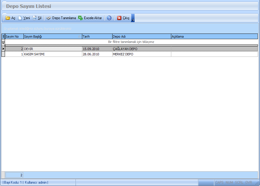 Tanımladığınız depoların arasındaki transfer işlemlerini gerçekleştirebildiğiniz gibi tanımlı olan bu depolarda sayım işlemlerinizi de takip edebilirsiniz. Tıkladığınız anda aşağıdaki gibi Depo Sayım Listesini ekrana getirecektir.