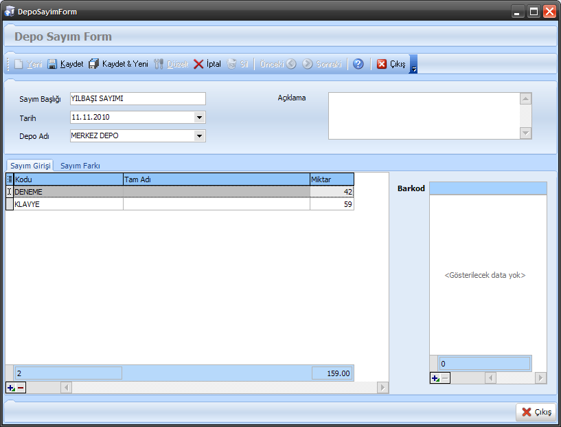 Yeni tuşuna bastığınız anda aşağıdaki Sayım Formu ekrana gelecektir.Sayım başlığını girdikten sonra (Örn; Yılbaşı sayımı gibi) sayım tarihini belirleyerek depo adını seçmelisiniz.Sayım Girişi sekmesinde '+' tuşuna basarak stokları seçip sayım adetlerini girmeniz yeterlidir.Sayım farkları sekmesinde oluşan farkları liste halinde alabilirsiniz.