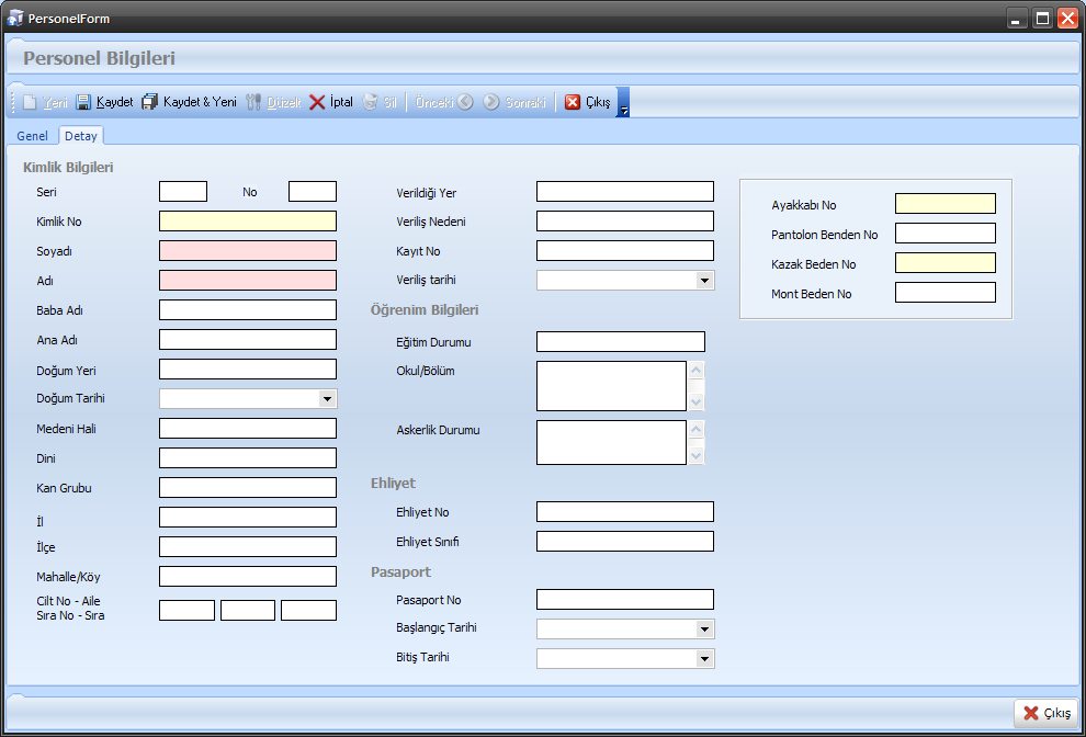 İstersek personel girişi sırasında Detay sekmesine tıklayarak Personelimiz ile ilgili kimlik bilgilerinden öğrenim bilgilerine hatta işletmemizde standart bir kıyafet uygulaması söz konusu ise kıyafet bilgilerini dahi sistemde kayıtlı tutabiliriz.