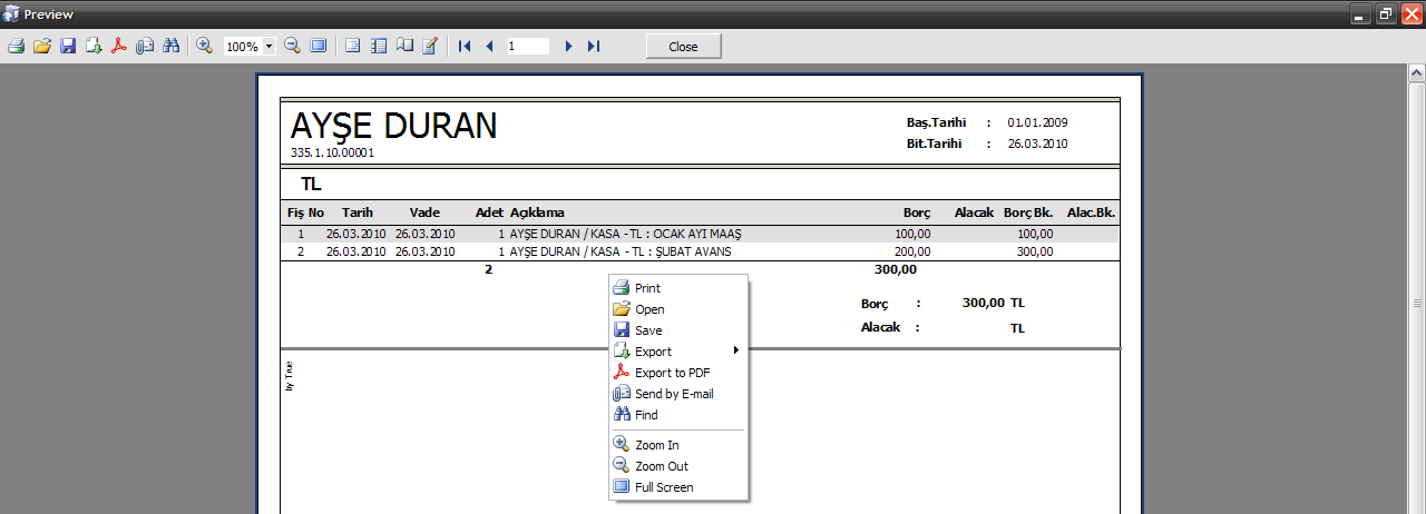 Çalıştığımız müşterilerimiz ve satıcılarımız ile aramızda olan hesap hareketlerinin dip toplamlarını yazdır ekranında karşımıza getirir. Böylelikle karşılıklı mutabık olup olmadığımızı teyitleşebiliriz.Yazdır: