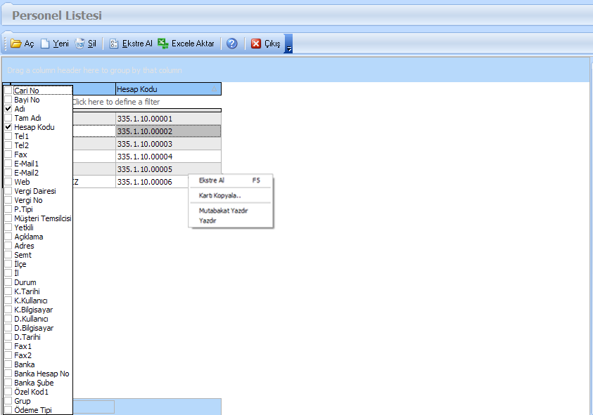 Programda tanımlamalardaki (stok ekranı hariç) liste ekranlarının tümünde fare ile sağ tıkladığımızda aşağıdaki listeyi getirecektir.