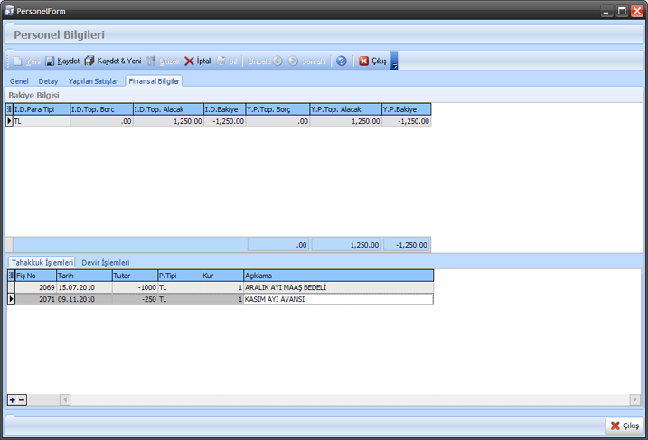 Finansal Detaylar sekmesinde ise aşağıda görüldüğü üzere tahakkuk girişlerini yapabiliriz.Alt kısımdaki Tahakkuk işlemleri bölümünde ‘+’ tuşuna basarak bir satır açıp sütun içerisine Tutarı girmemiz yeterlidir. Personeller çalıştığı ay içerisinde hakedişleri doğar dolayısıyla alacaklarınır.Personeli alacaklandırma işlemini bu alanda tutarın başına '-' eksi yazarak gerçekleştirmeliyiz.Örneğin; Aşağıdaki örnekte de olduğu gibi X personelimizin tahakkuk işlemini gerçekleştirelim.Tarih kısmını ve para tipini istediğimiz şekilde değiştirebiliriz.Personeli alacaklandırmak istediğimiz için -1000 TL olarak yazıyoruz.Bilgileri girdikten sonra klavyenin alt ok ve üst ok tuşlarına birer kez bastığımızda girdiğimiz tutarı müşterinin alacak hanesine yazacaktır.Daha sonra personellere maaş ödemesini Kasa veya Banka işlemlerimden gerçekleştirebilirsiniz.